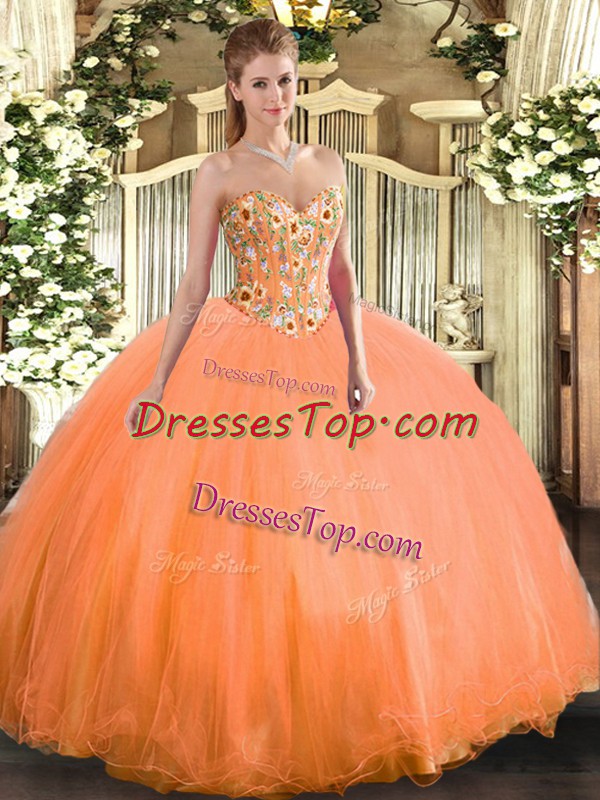 Glittering Orange Lace Up Quinceanera Gown Embroidery Sleeveless Floor Length