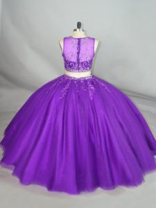 Glittering Purple Zipper Scoop Beading Ball Gown Prom Dress Tulle Sleeveless