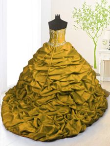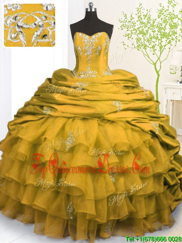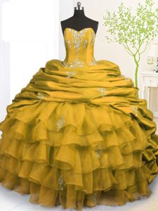 Glittering Sleeveless Brush Train Lace Up With Train Beading and Appliques and Ruffled Layers and Pick Ups Ball Gown Prom Dress