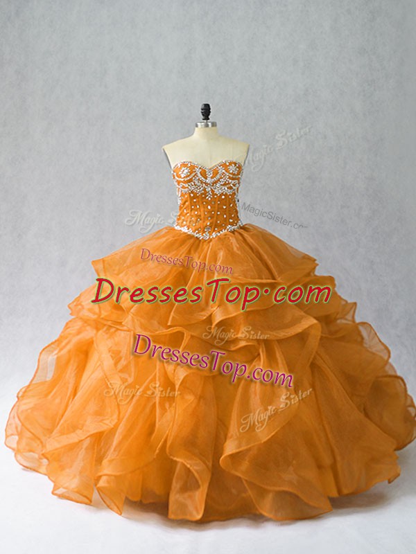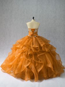 Glittering Sweetheart Sleeveless Quinceanera Gowns Floor Length Beading and Ruffles Orange Organza