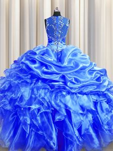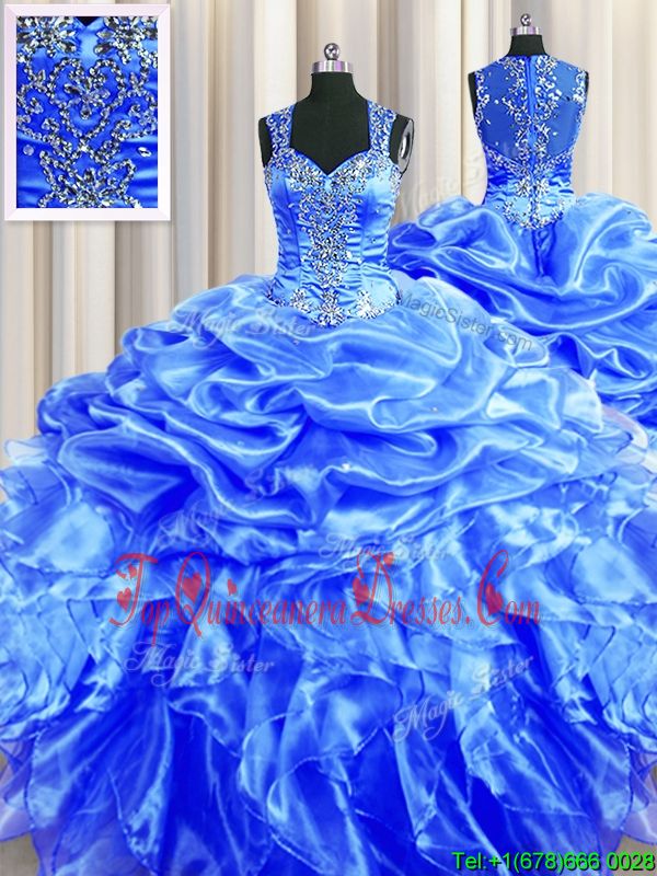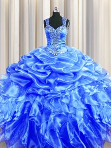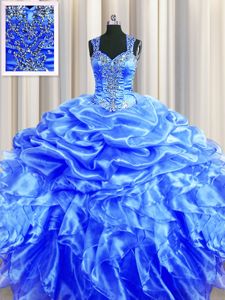 Glittering Zipper Up See Through Back Blue Ball Gowns Straps Sleeveless Organza Floor Length Zipper Beading and Ruffles and Pick Ups Sweet 16 Dresses