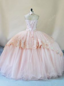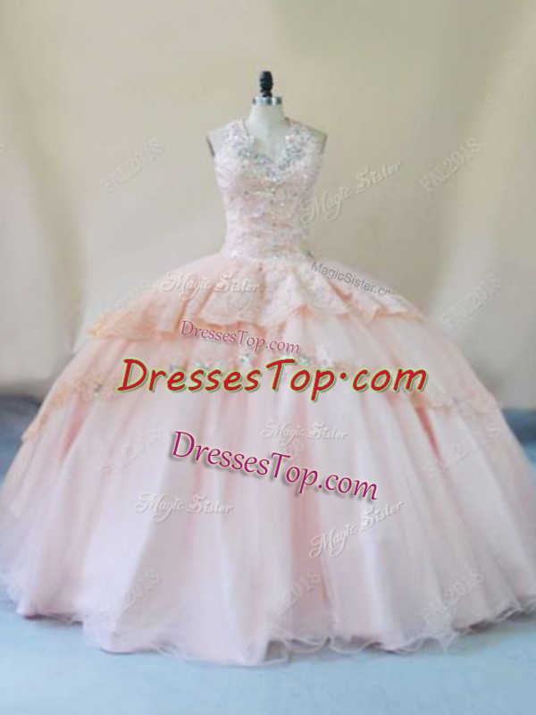 Glorious Ball Gowns Quinceanera Gown Peach Halter Top Tulle Sleeveless Lace Up