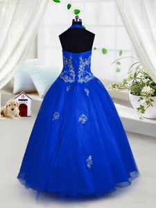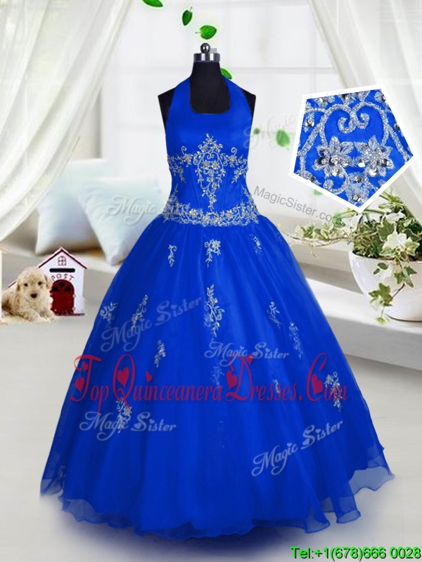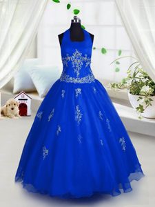 Glorious Blue A-line Tulle Halter Top Sleeveless Appliques Floor Length Lace Up Little Girl Pageant Dress
