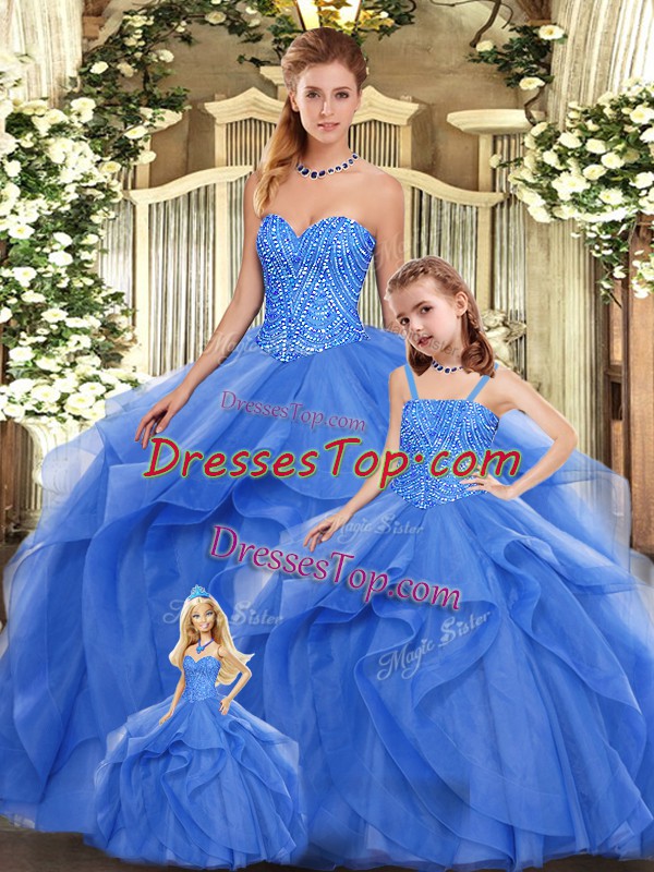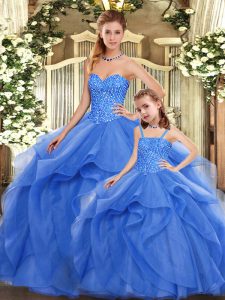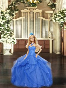 Glorious Blue Organza Lace Up Sweetheart Sleeveless Floor Length Sweet 16 Dress Beading and Ruffles
