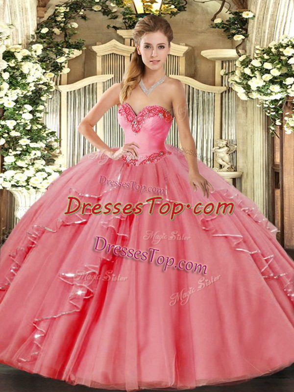 Glorious Floor Length Lace Up Quinceanera Dresses Watermelon Red for Military Ball and Sweet 16 and Quinceanera with Beading and Ruffled Layers
