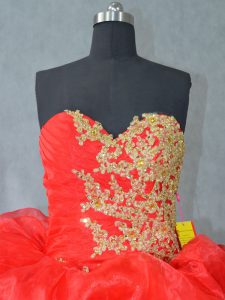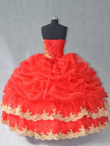 Glorious Floor Length Lace Up Sweet 16 Quinceanera Dress Red for Military Ball and Sweet 16 and Quinceanera with Lace and Appliques and Pick Ups