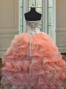 Glorious Hot Pink Quince Ball Gowns Military Ball and Sweet 16 and Quinceanera and For with Beading and Ruffles Sweetheart Sleeveless Lace Up