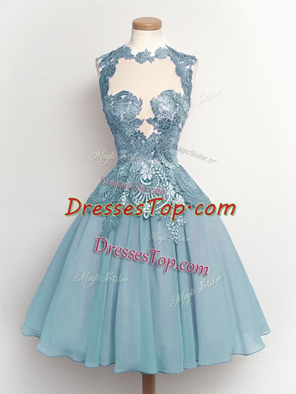 Glorious Light Blue A-line Lace Dama Dress Lace Up Chiffon Sleeveless Knee Length