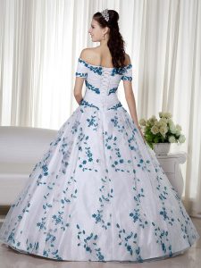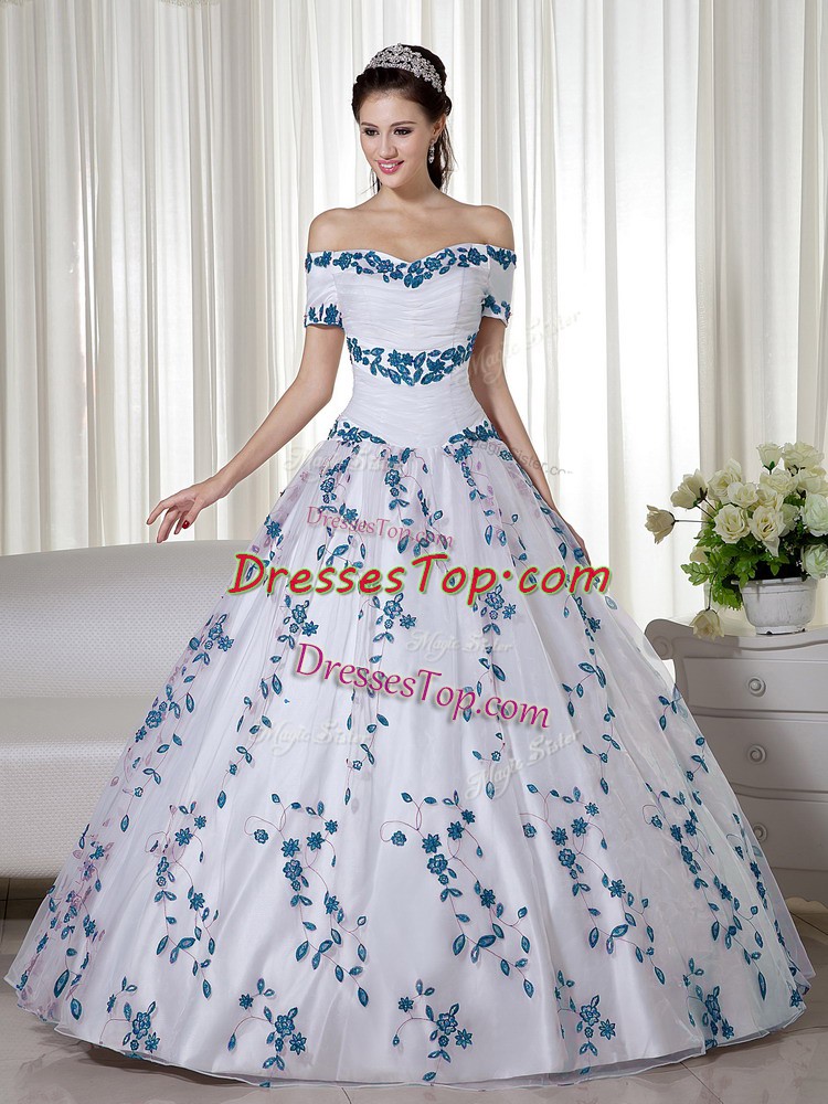 Glorious Off The Shoulder Short Sleeves Quinceanera Gowns Floor Length Embroidery White Organza