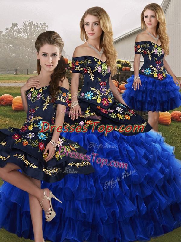 Glorious Sleeveless Floor Length Embroidery and Ruffled Layers Lace Up Quince Ball Gowns with Blue And Black