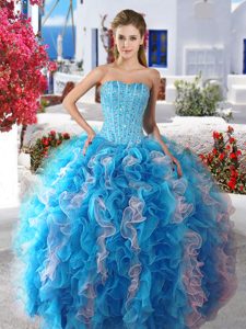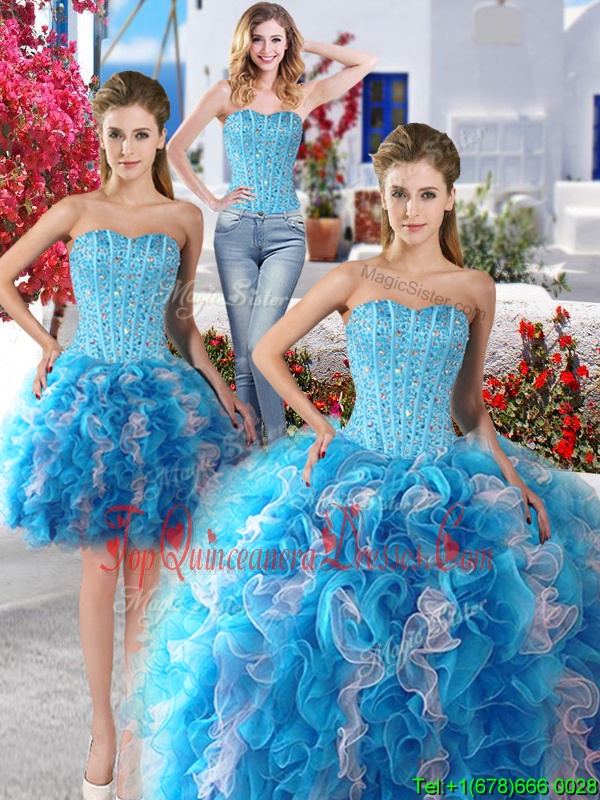 Glorious Three Piece White and Baby Blue Lace Up Sweetheart Beading Sweet 16 Dresses Organza Sleeveless