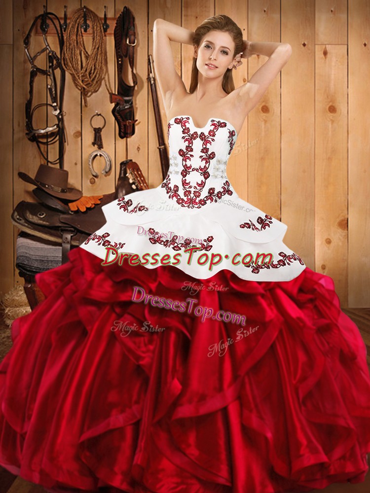 Glorious Wine Red Sleeveless Satin and Organza Lace Up Quinceanera Gown for Military Ball and Sweet 16 and Quinceanera