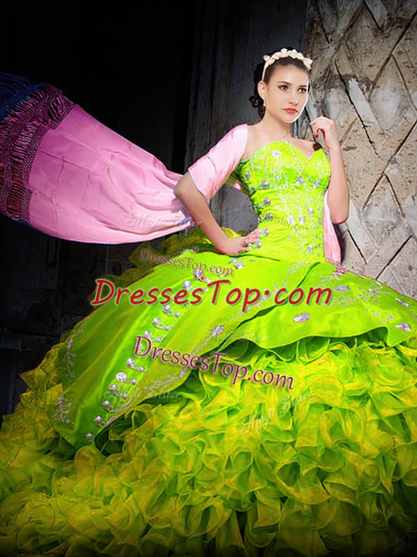 Glorious Yellow Green Organza Lace Up Sweetheart Sleeveless Sweet 16 Quinceanera Dress Brush Train Embroidery and Ruffles