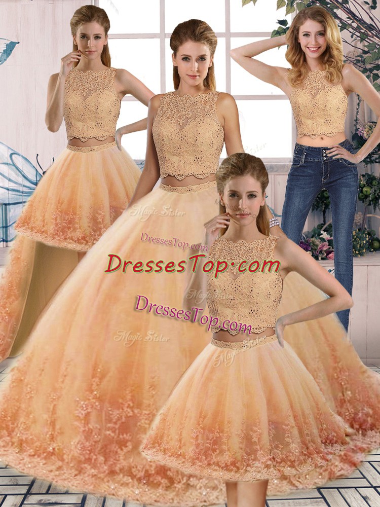 Gold and Peach Quinceanera Dresses Scalloped Sleeveless Sweep Train Backless