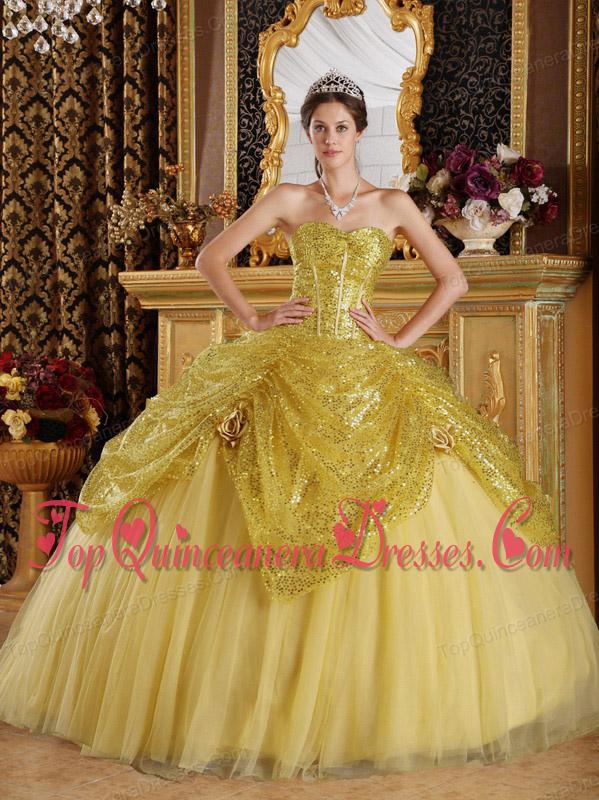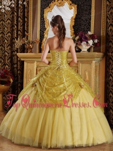 Gold Ball Gown Sweetheart Floor-length Sequined and Tulle Handle Flowers Quinceanera Dress