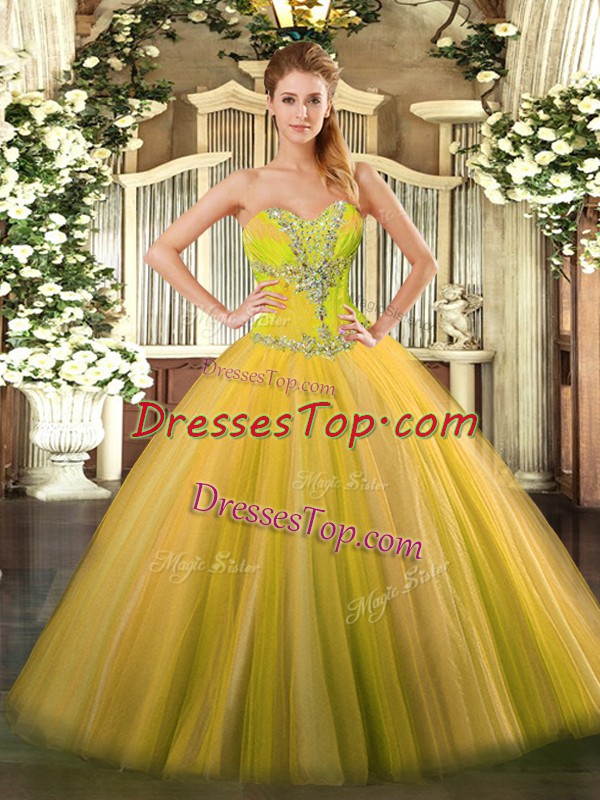 Gold Ball Gowns Beading 15th Birthday Dress Lace Up Tulle Sleeveless Floor Length