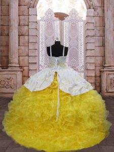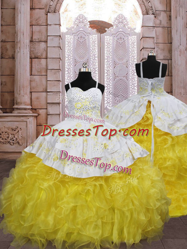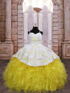 Gold Ball Gowns Embroidery and Ruffles Little Girl Pageant Gowns Lace Up Organza Sleeveless