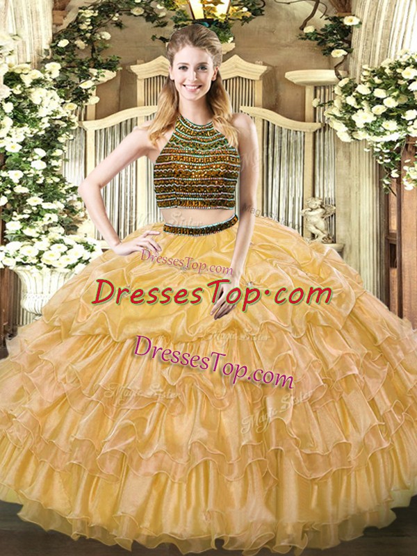 Gold Ball Gowns Organza Halter Top Sleeveless Beading and Ruffled Layers Floor Length Zipper Quinceanera Gowns