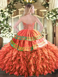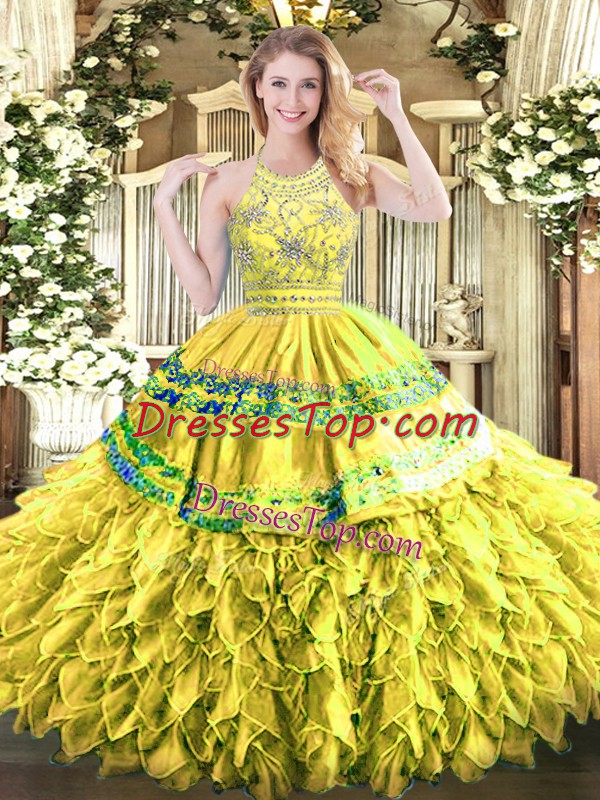 Gold Ball Gowns Organza Halter Top Sleeveless Beading and Ruffles Floor Length Zipper Quince Ball Gowns