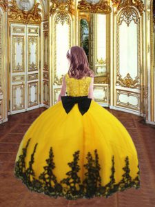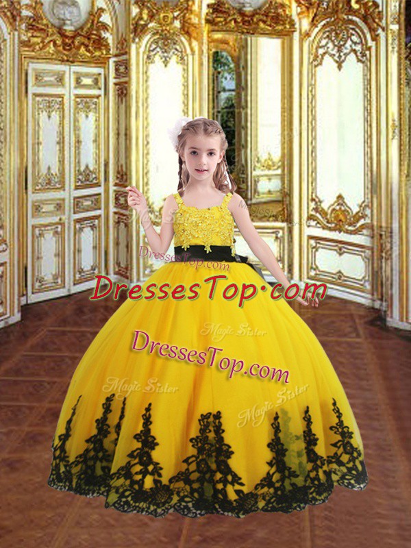Gold Ball Gowns Tulle Spaghetti Straps Sleeveless Lace and Appliques Floor Length Zipper Pageant Dress