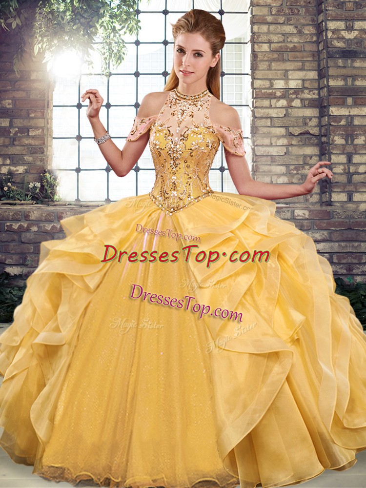 Gold Lace Up Halter Top Beading and Ruffles 15th Birthday Dress Organza Sleeveless