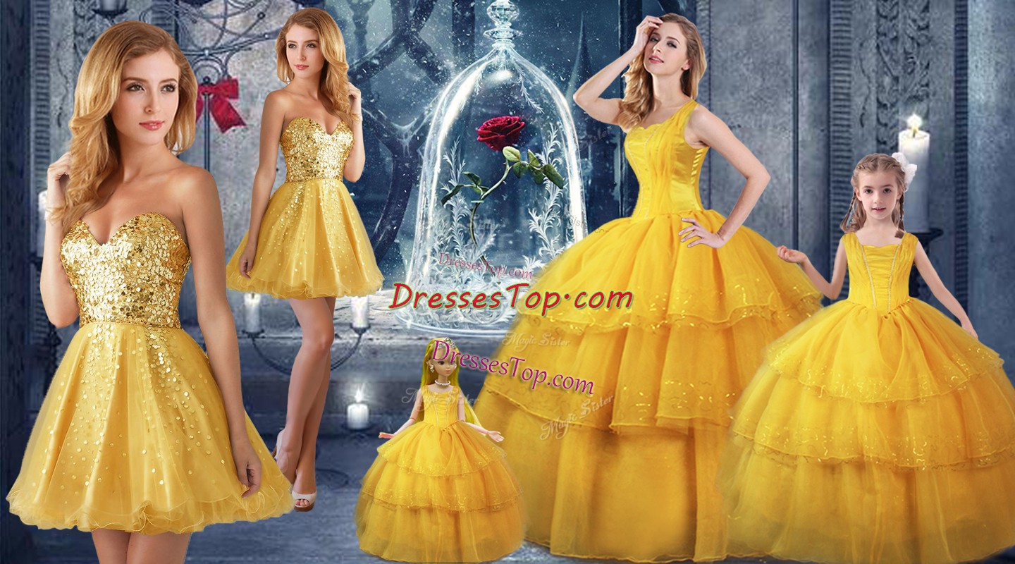 Gold Lace Up Quinceanera Gowns Ruffled Layers Sleeveless Floor Length