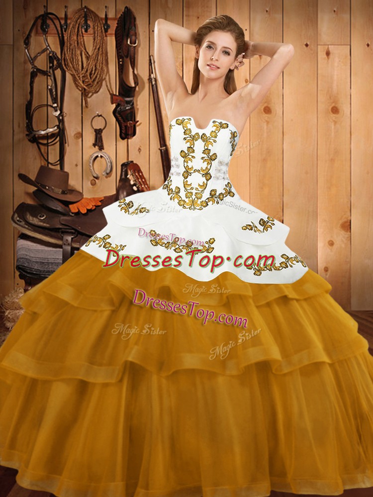 Gold Lace Up Strapless Embroidery and Ruffled Layers Vestidos de Quinceanera Tulle Sleeveless Sweep Train