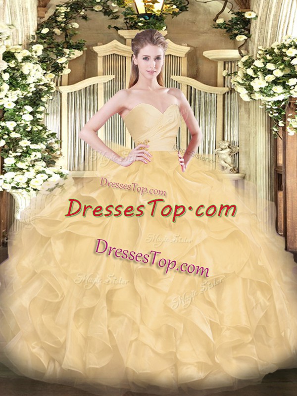 Gold Organza Lace Up Sweetheart Sleeveless Floor Length 15th Birthday Dress Beading and Ruffles