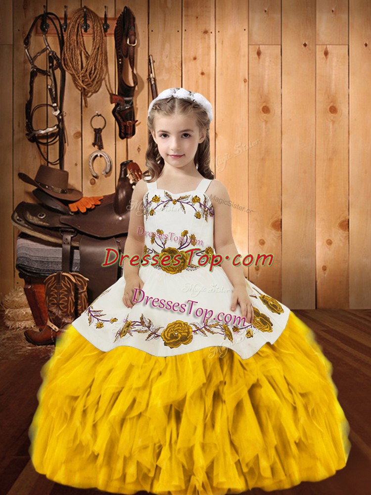 Gold Straps Lace Up Embroidery and Ruffles Child Pageant Dress Sleeveless