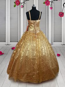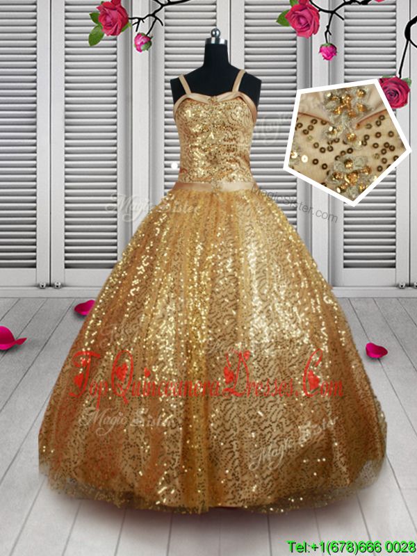 Gold Straps Neckline Beading and Sequins Little Girl Pageant Dress Sleeveless Lace Up