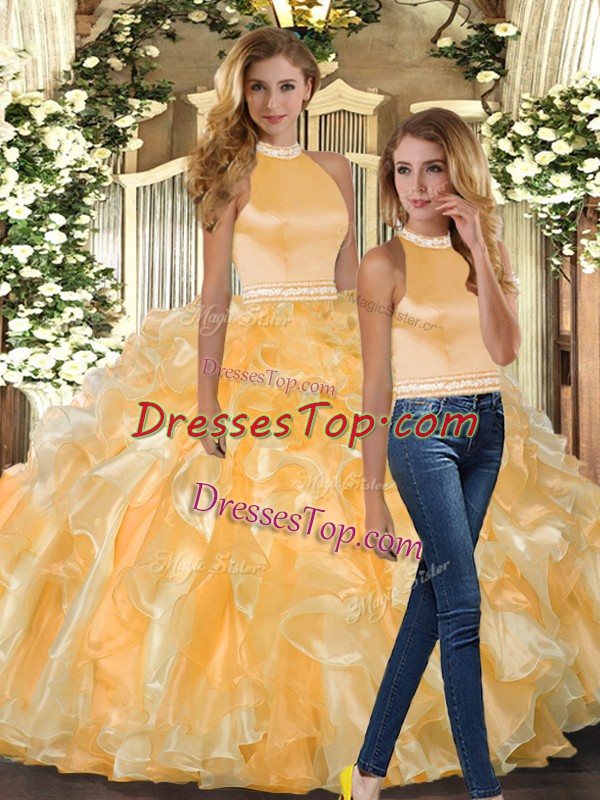 Gold Sweet 16 Dress Sweet 16 and Quinceanera with Beading and Ruffles Halter Top Sleeveless Backless