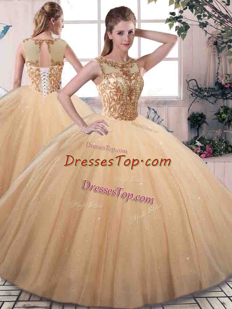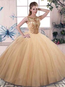 Gold Tulle Lace Up Scoop Sleeveless Floor Length 15th Birthday Dress Beading