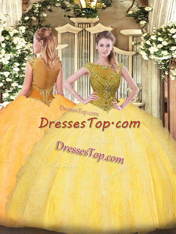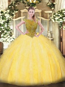 Gold Tulle Zipper Sweet 16 Quinceanera Dress Sleeveless Floor Length Beading and Ruffles