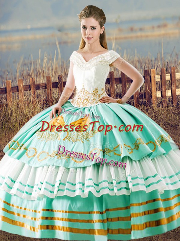 Gorgeous Aqua Blue Ball Gowns Satin V-neck Sleeveless Beading and Ruffled Layers Floor Length Lace Up Vestidos de Quinceanera