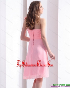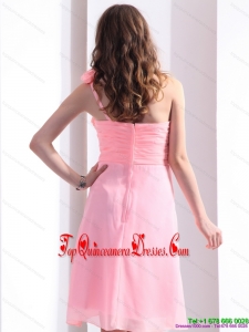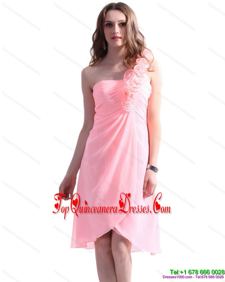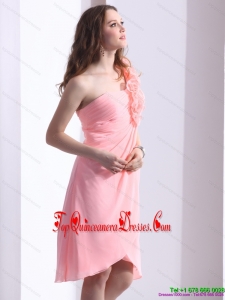 Gorgeous Baby Pink One Shoulder Prom Dresses with Ruching and Hand Made Flowers