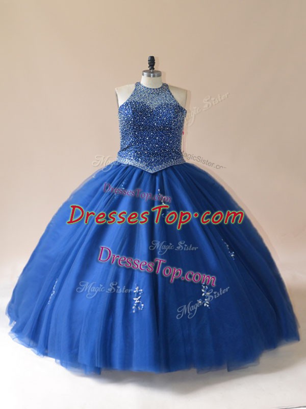 Gorgeous Blue Ball Gowns Tulle Scoop Sleeveless Beading Floor Length Lace Up Quinceanera Gowns
