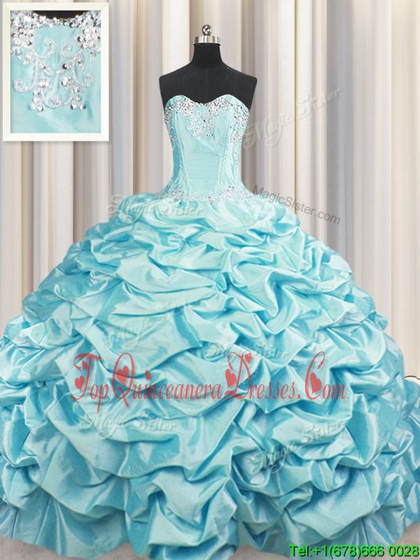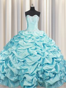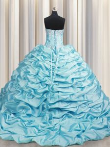 Gorgeous Brush Train Aqua Blue Taffeta Lace Up Sweet 16 Dresses Sleeveless Sweep Train Beading and Pick Ups