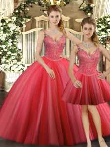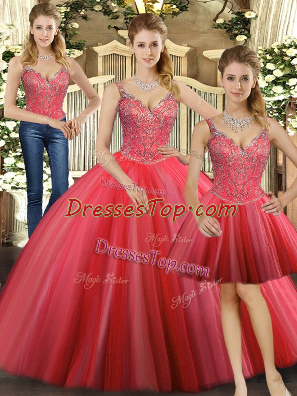 Gorgeous Coral Red Three Pieces Straps Sleeveless Tulle Floor Length Lace Up Beading Sweet 16 Dress