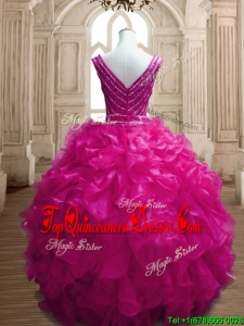 Gorgeous Deep V Neckline Beading and Ruffles Quinceanera Dress in Fuchsia