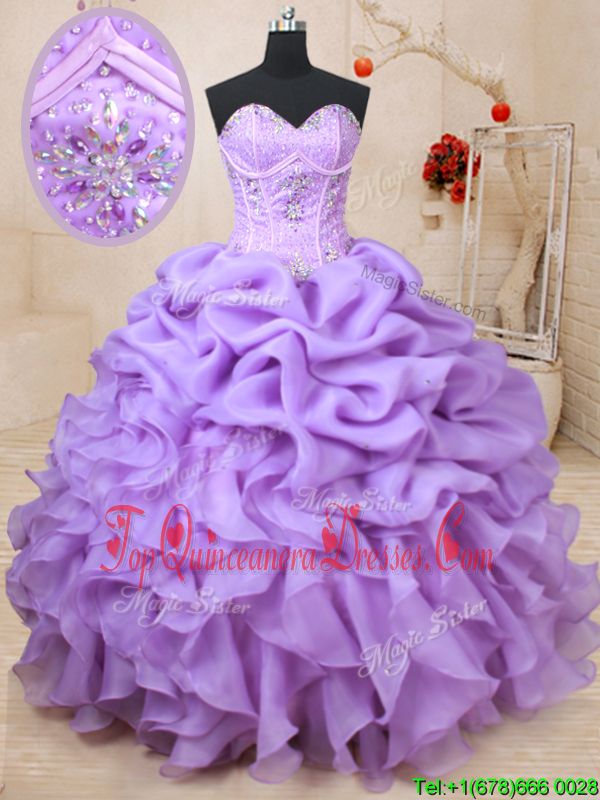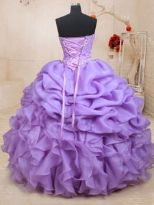 Gorgeous Floor Length Lavender Quince Ball Gowns Organza Sleeveless Beading and Ruffles and Pick Ups