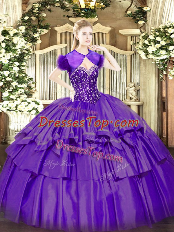 Gorgeous Floor Length Purple Quinceanera Dress Organza and Taffeta Sleeveless Beading and Ruffled Layers