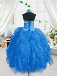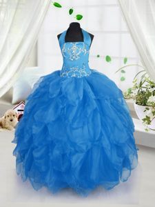 Gorgeous Halter Top Baby Blue Ball Gowns Appliques and Ruffles Little Girls Pageant Dress Wholesale Lace Up Organza Sleeveless Floor Length