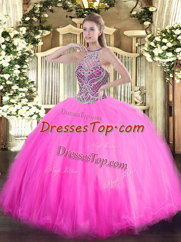 Gorgeous Halter Top Sleeveless Sweet 16 Quinceanera Dress Floor Length Beading Rose Pink Tulle