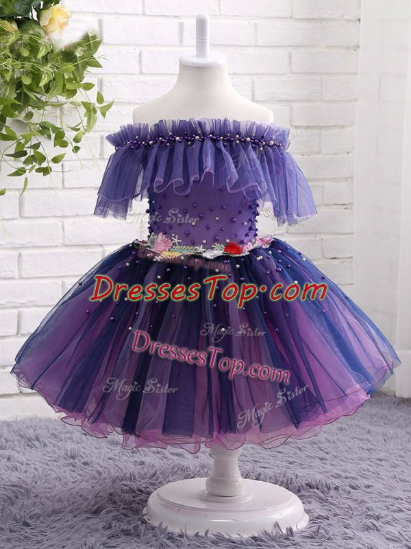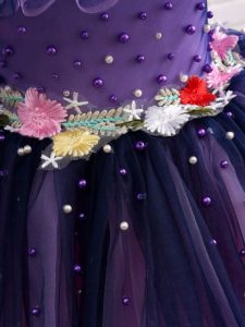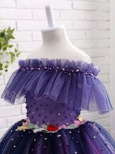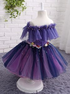 Gorgeous Knee Length Purple Evening Gowns Tulle Short Sleeves Beading and Hand Made Flower