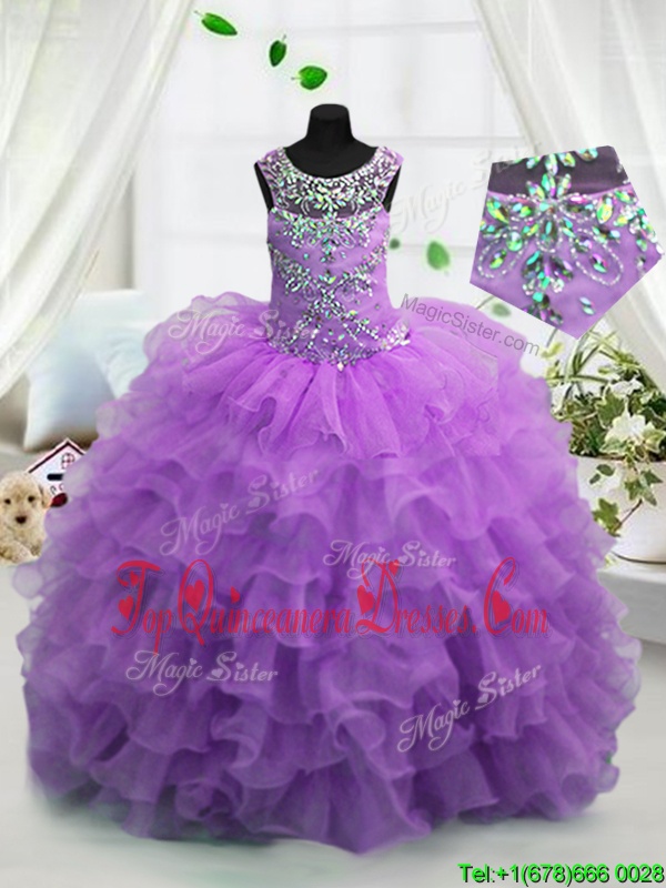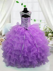 Gorgeous Lavender Ball Gowns Scoop Sleeveless Organza Floor Length Lace Up Beading and Ruffled Layers Little Girl Pageant Gowns