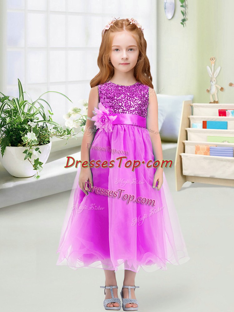 Gorgeous Lilac Organza Zipper Scoop Sleeveless Tea Length Little Girls Pageant Dress Sequins and Hand Made Flower