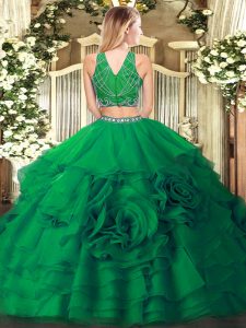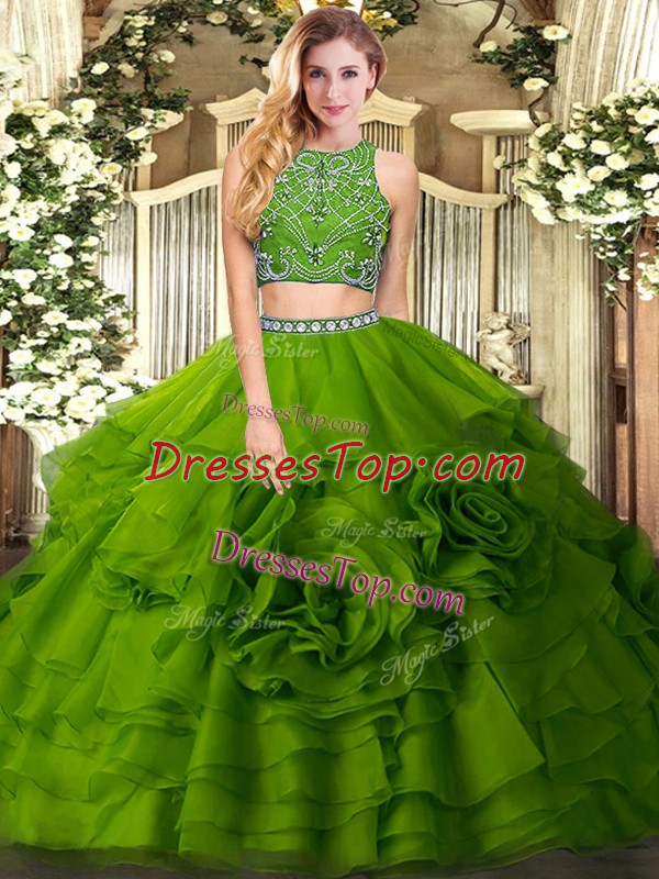 Gorgeous Olive Green Quinceanera Dress Military Ball and Sweet 16 and Quinceanera with Beading and Ruffled Layers High-neck Sleeveless Zipper