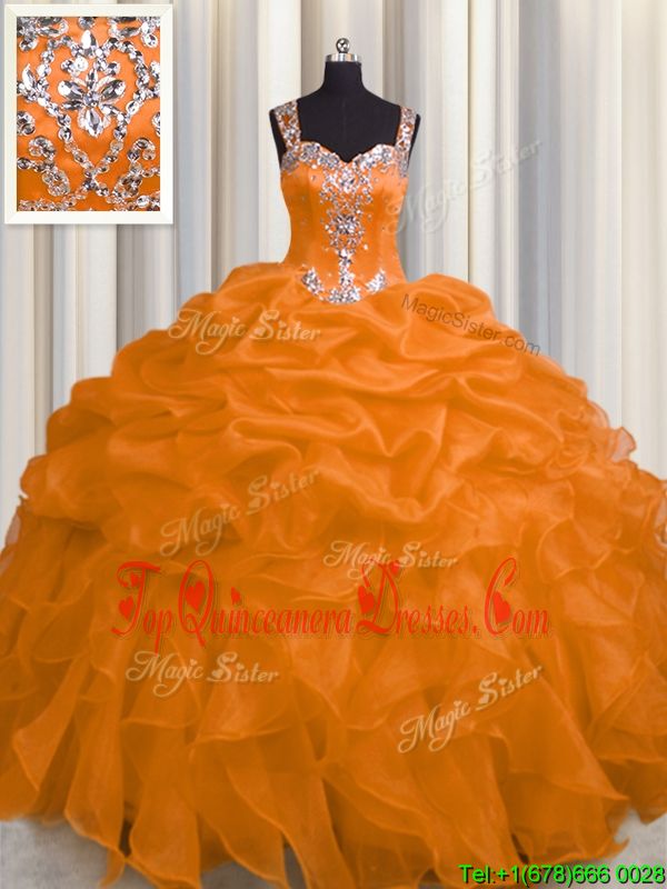 Gorgeous See Through Zipper Up Floor Length Zipper Quinceanera Dress Orange and In for Military Ball and Sweet 16 and Quinceanera with Appliques and Ruffles