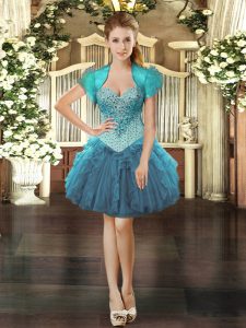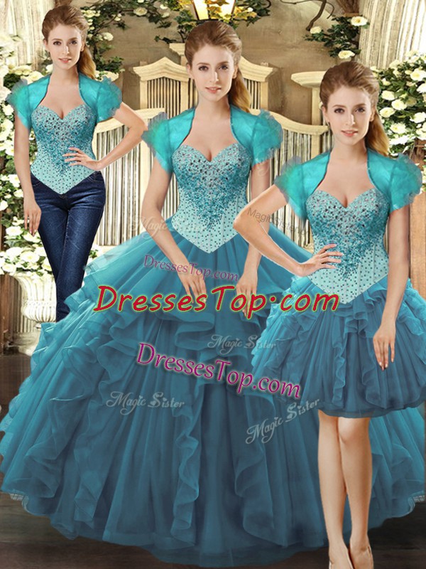 Gorgeous Teal Lace Up Straps Beading and Ruffles Quinceanera Gowns Tulle Sleeveless