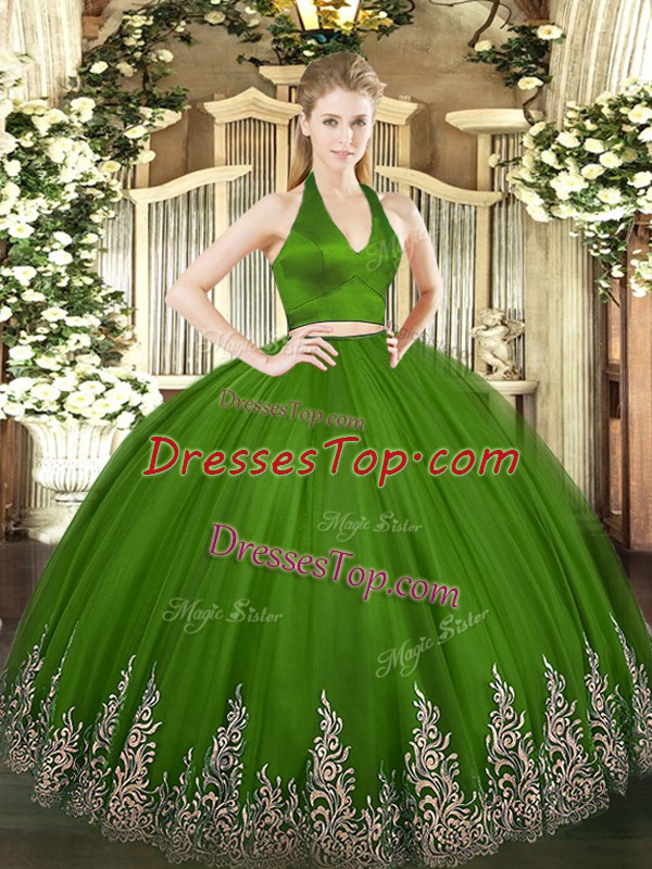 Gorgeous Tulle Halter Top Sleeveless Zipper Appliques Sweet 16 Dress in Green